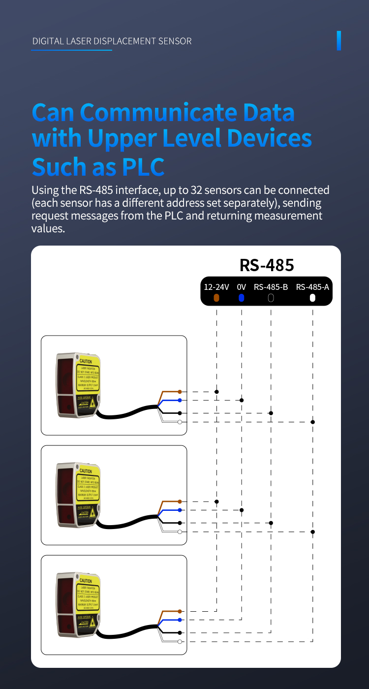 Ved hjælp af RS-485-interfacet kan op til 32 sensorer tilsluttes (hver sensor har en forskellig adresse indstillet separat), sender anmodningsmeddelelser fra PLC'en og returnerer måleværdier.