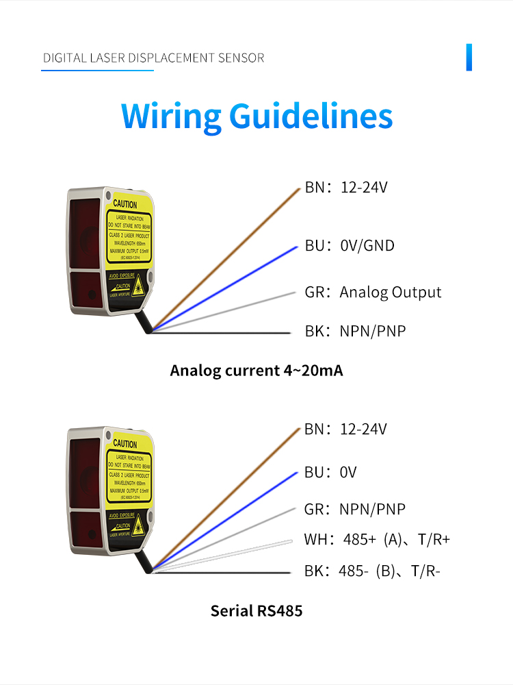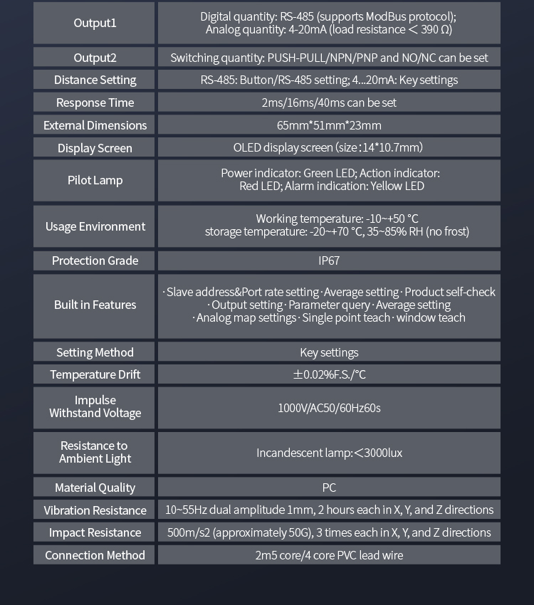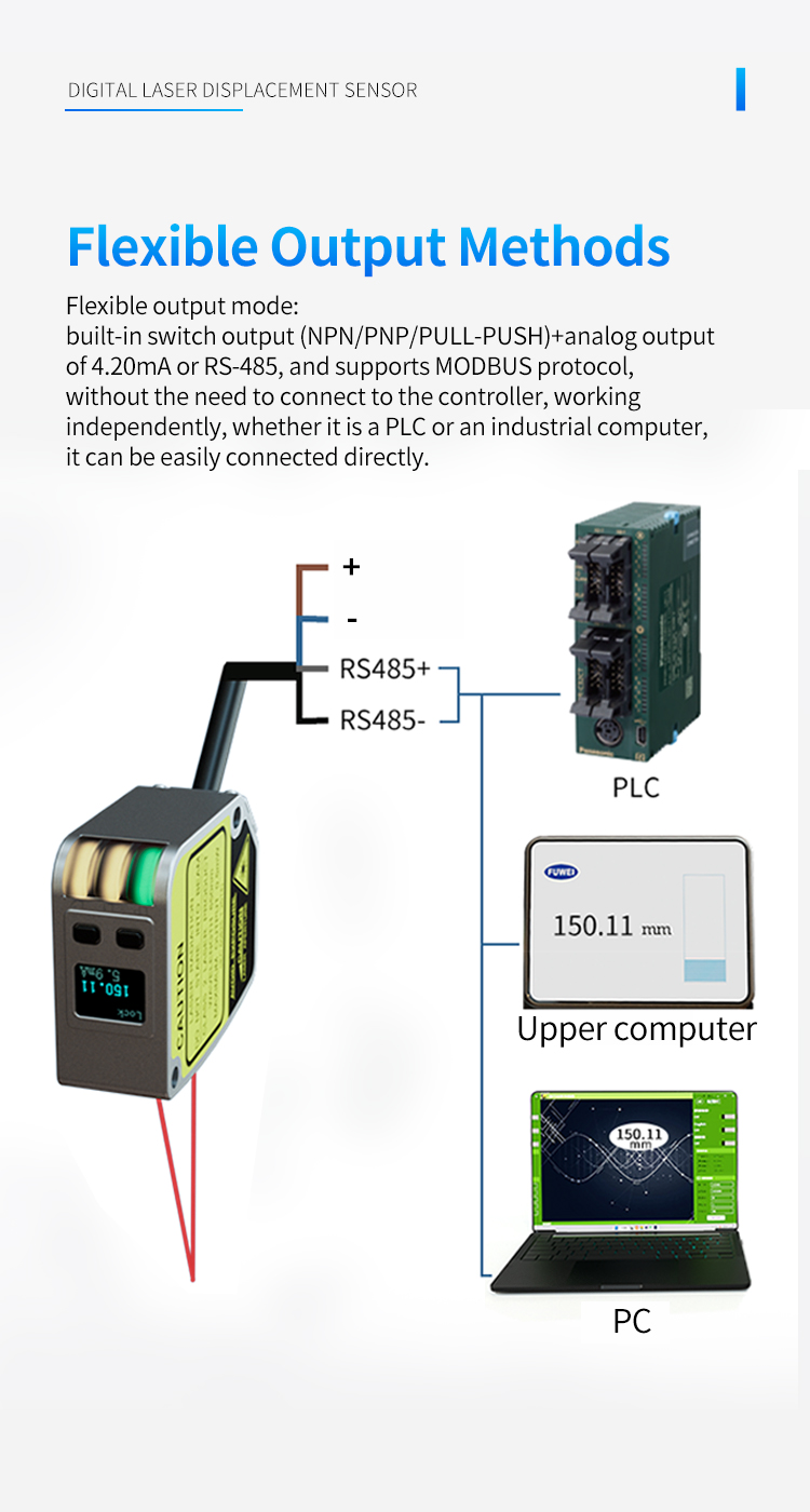Fleksibel udgangstilstand: indbygget switch-udgang (NPN/PNP/PULL-PUSH) + analog udgang på 4,20mA eller RS-485, og understøtter MODBUS-protokol, uden behov for at forbinde til controlleren, arbejder uafhængigt, uanset om det er en PLC eller en industriel computer, den kan nemt tilsluttes direkte.