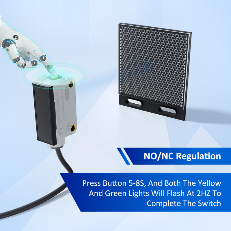 Enheden er udstyret med meget intelligente justeringsfunktioner. Afstandsindstillinger er intuitive og praktiske: Juster med den reflekterende plade, tryk på knappen i 2-5 sekunder, og det gulgrønne lys, der blinker ved 4Hz, angiver en vellykket opsætning; Hvis dobbeltlysene skifter til 8Hz asynkron blinkende, indikerer det fiasko og skifter automatisk til den maksimale detektionsafstand. Skift mellem normalt åbne (NO) og normalt lukkede (NC) -tilstande er lige så effektiv-tryk på knappen i 5-8 sekunder, og dobbeltlysene blinker synkroniseret ved 2Hz for at bekræfte, at tilstandskontakten er komplet. Denne multiscenario-kompatible linse-reflekterende fotoelektriske switch gør parameterjustering mere intuitiv end nogensinde.