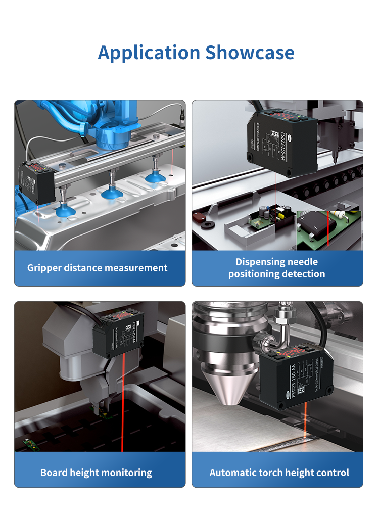 Traditionelle sensorer tvinges ofte til at tilpasse flere modeller af udstyr på grund af et smalt interval (såsom fast 30 mm detektionsområde), hvilket resulterer i en stigning i produktionslinjeplementeringsomkostninger. FSD23-serie laserfortrængningssensorer realiserer imidlertid et kontinuerligt justerbart detektionsområde fra 10 mm til 250 mm gennem selvudviklede optiske moduldynamisk fokuseringsteknologi, som er egnet til alle scenarier, der spænder fra mikron chip-lodningsledninger til bilplade-metalhuller.