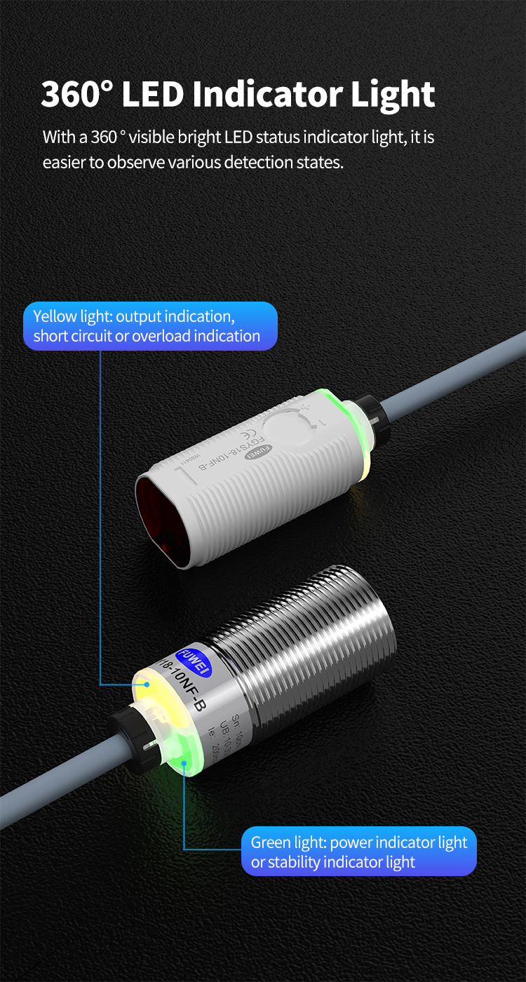 FGY18-10NU-B har en lys, 360 ° synlig LED-statusindikator. Operatører kan ubesværet overvåge sensorens operationelle status fra enhver vinkel. Dette design letter markant overvågning og fejlfinding af realtid for CNC-maskineoperatører, hvilket reducerer nedetid forårsaget af uklare statusindikatorer og øger produktionseffektiviteten.