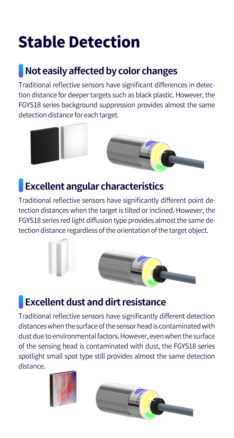 Traditionelle sensorer undlader ofte at detektere objekter på grund af farve- eller materielle variationer. FGY18-10NU-B anvender avanceret optisk design for at opnå stabil detektion af objekter uanset farve eller materiale. Uanset om detektering af metaldele, plastiske arbejdsemner eller mørkfarvede materialer under CNC-bearbejdning, opretholder det ensartet følsomhed, hvilket sikrer problemfri og nøjagtige produktionsprocesser.