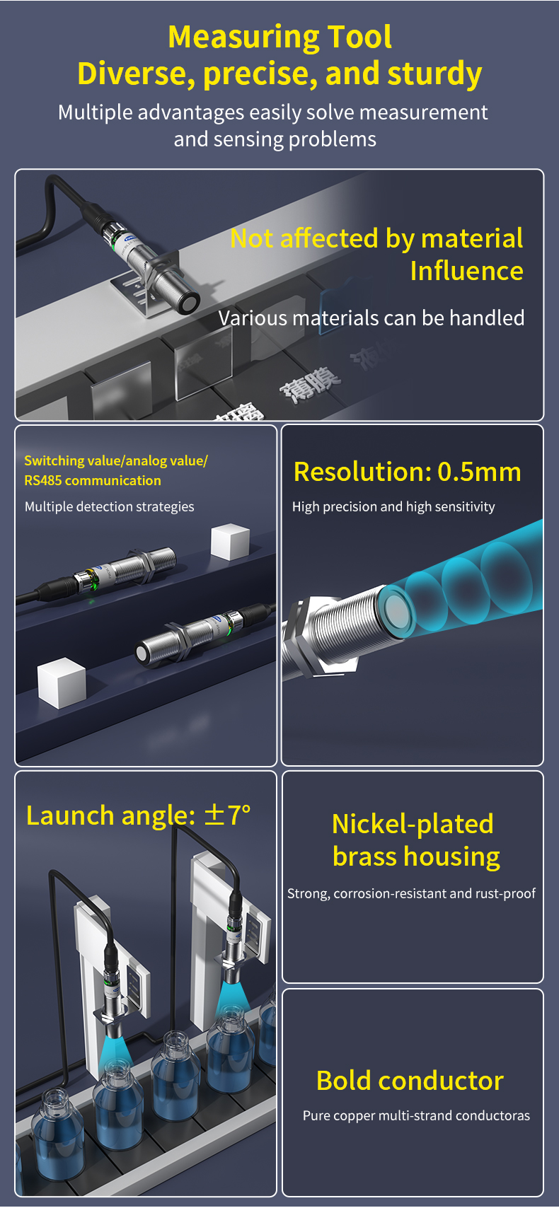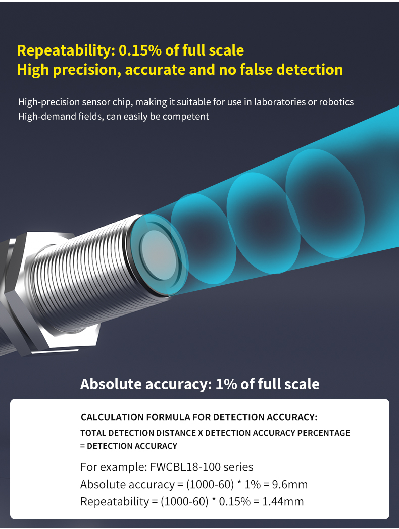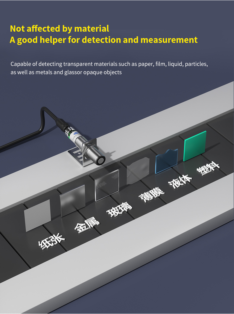 Med høj præcision på 0,5 mm opløsning og en smal emissionsvinkel på ±7° sikrer den ekstrem målenøjagtighed og fremragende modstandsdygtighed over for interferens. Uanset måloverfladen – lysabsorberende, reflekterende eller gennemsigtig – leverer den stabil ydeevne, fuldstændig upåvirket af materialet eller farven på det detekterede objekt.