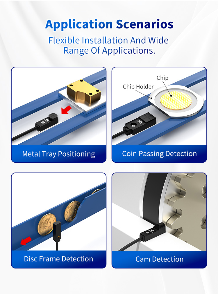 Det robuste funktionssæt i FSNS12D-04N gør den usædvanlig alsidig på tværs af et bredt spektrum af industrier: Metalbakkepositionering: Sikrer præcis placeringsdetektering i automatiserede lagrings- og genfindingssystemer (ASRS) og til AGV-vejledning.Disc Frame Detection: Giver pålidelig nøjagtig tilstedeværelsesregistrering for diskholdere i detektion af halvledere og elektroniske mønter. optælling og validering i salgsautomater, spillehaller og finansielle kiosker. Cam Detection: Overvåger position, hastighed og timing af knaster i automatiseret maskineri og roterende indeksere for præcis sekventiel kontrol.