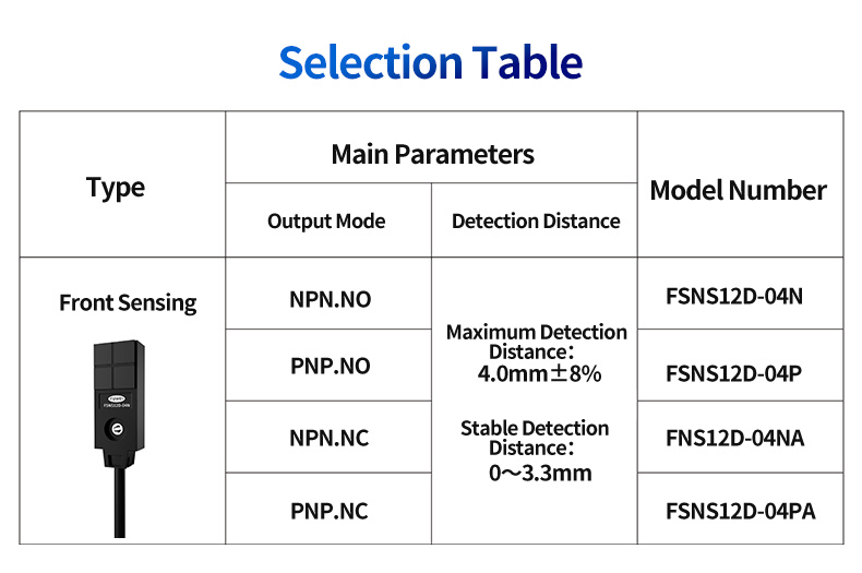 Efterhånden som maskineri bliver mere kompakte, er sensorejendomme til en præmie. FSNS12D-04N har et kompakt design, der er specielt udviklet til smalle installationsarbejdsområder. Dens lille formfaktor gør, at den uden besvær kan integreres i snævre steder som robotgribere, siderne på miniaturetransportører eller inden for mekanismerne af møntpasserende detektionsenheder. Denne brugervenlige, kompakte konstruktion sparer ikke kun afgørende plads, men udvider også omfanget af potentielle anvendelsesscenarier.